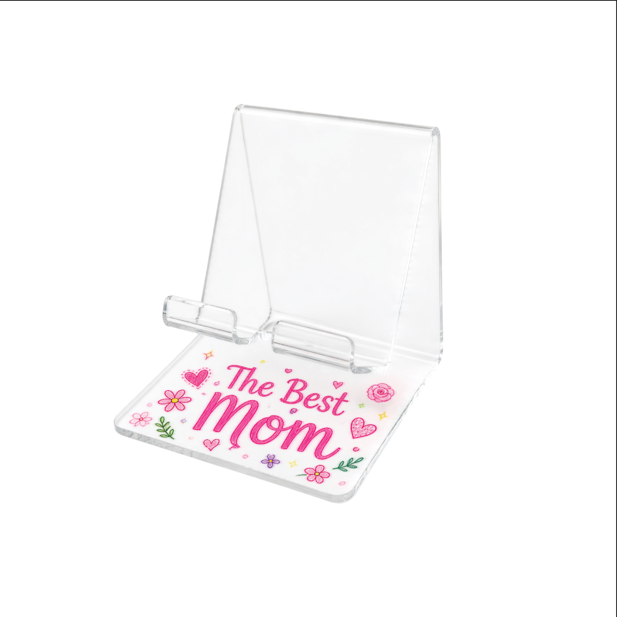 Portacelular de acrílico liviano de 3 mm, con medida de 9.5 cm x 11 cm. Incluye base de soporte y espacio práctico para cargar tu celular mientras lo mantienes en posición segura.