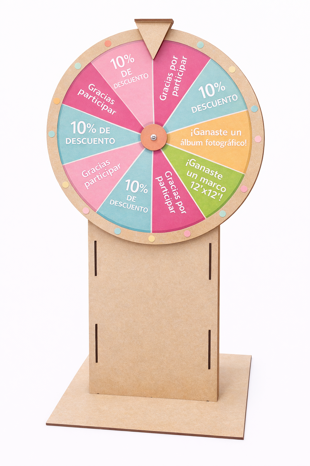 Ruleta de 30cm de diametroa en vinly sobre Material biodegradable MDF de 3mm liviano, con corte láser inclye base para soporte